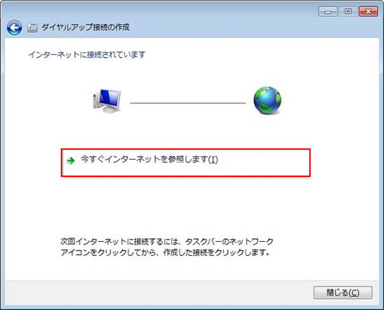 【今すぐインターネットを参照します】をクリックするか、このウインドウを閉じて、ブラウザを直接起動すればインターネットにつながっていることが確認できます。